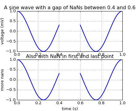 title('A sine wave with a gap of NaNs between 0.4 and 0.6')