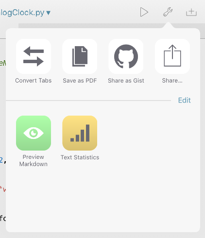 (+)button in the bottom-righthand corner (while editing) to insert colors, image, font or sound effect names. This is mostly meant for use with theui,scene, andPILmodules, but may also be helpful for web development.Use the “Highlight All” menu item after selecting a word to quickly see all places where e.g. a variable name is used in your script.