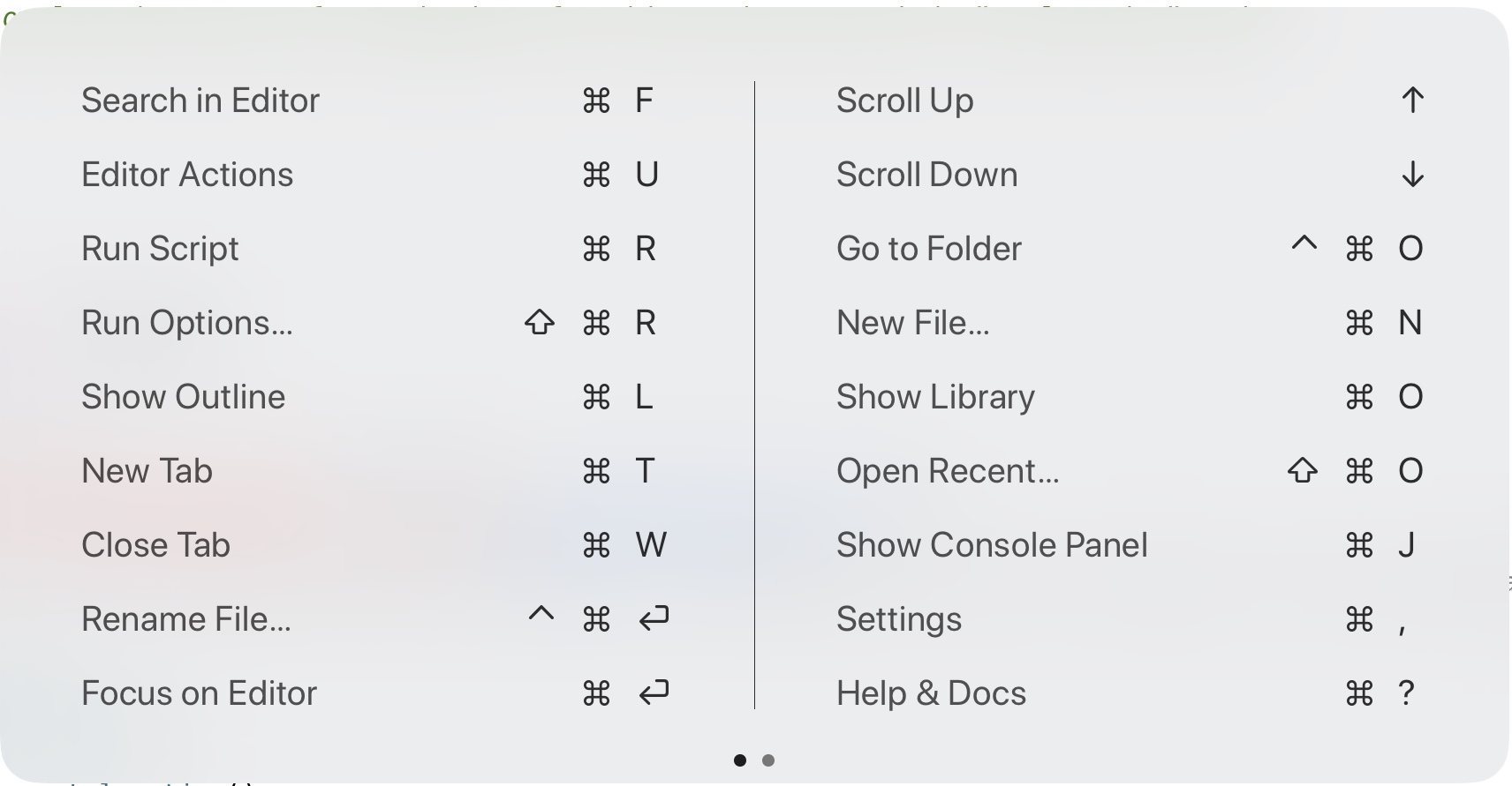 Press and hold the Cmd (⌘) key at any time to show a list of available shortcuts. Some shortcuts are only available in certain modes, e.g. while editing code or in the console.
