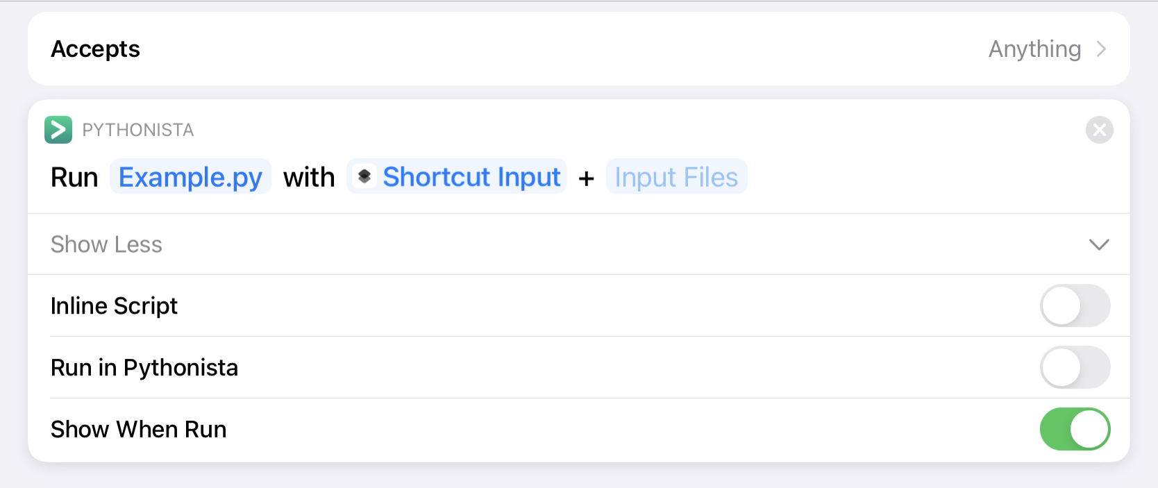 The “Show When Run” option determines whether the action’s output will be shown in the Shortcuts app after the script has run. This only has an effect when “Run in Pythonista” is off. When you turn this off, the action will still pass output to the next action in the workflow, but no UI will be shown.
