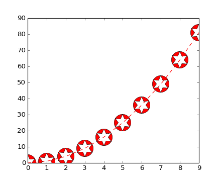 plt.plot(np.arange(10)**2, '--r', marker=cut_star, markersize=15)