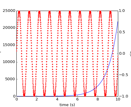 A frequent request is to have two scales for the left and right y-axis, which is possible using twinx() (more than two scales are not currently supported, though it is on the wish list). This works pretty well, though there are some quirks when you are trying to interactively pan and zoom, because both scales do not get the signals.