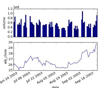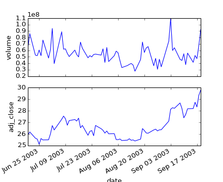 plotfile(fname, ('date', 'volume', 'adj_close'))