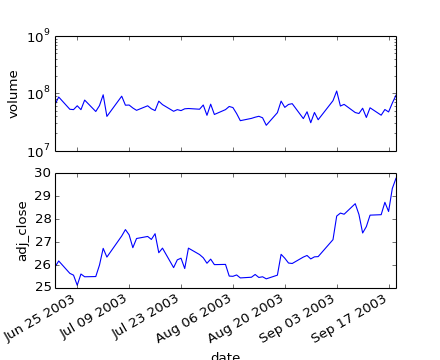 plotfile(fname, ('date', 'volume', 'adj_close'), plotfuncs={'volume': 'semilogy'})