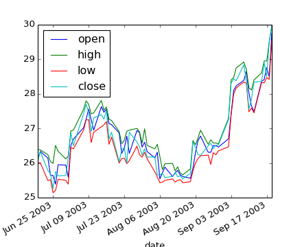 plotfile(fname, ('date', 'open', 'high', 'low', 'close'), subplots=False)