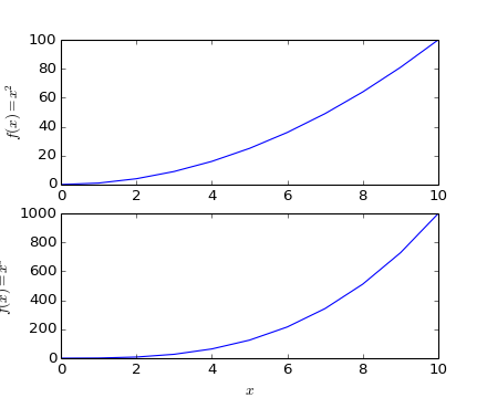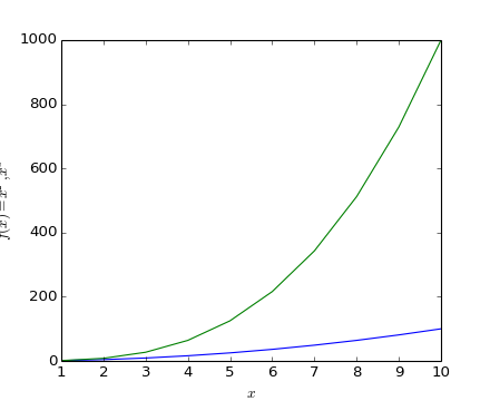 gca().set_ylabel(r'$f(x) = x^2, x^3$')