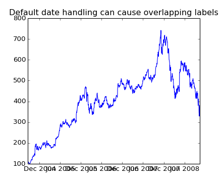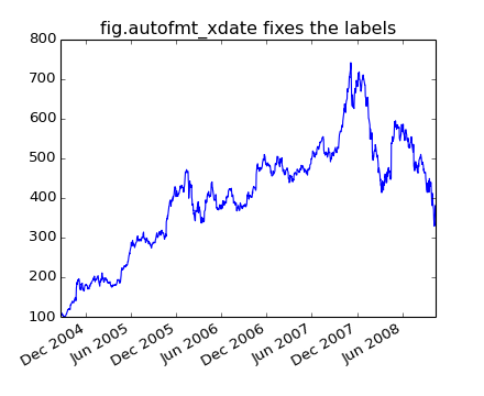 Another annoyance is that if you hover the mouse over a the window and look in the lower right corner of the matplotlib toolbar (Interactive navigation) at the x and y coordinates, you see that the x locations are formatted the same way the tick labels are, eg “Dec 2004”. What we’d like is for the location in the toolbar to have a higher degree of precision, eg giving us the exact date out mouse is hovering over. To fix the first problem, we can use matplotlib.figure.Figure.autofmt_xdate() and to fix the second problem we can use the ax.fmt_xdata attribute which can be set to any function that takes a scalar and returns a string. matplotlib has a number of date formatters built in, so we’ll use one of those.