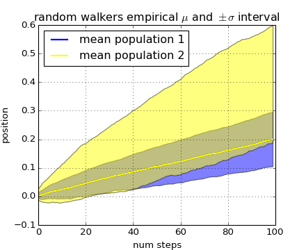 Our next example computes two populations of random walkers with a different mean and standard deviation of the normal distributions from which the steps are drawn. We use shared regions to plot +/- one standard deviation of the mean position of the population. Here the alpha channel is useful, not just aesthetic.