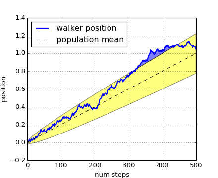 The where keyword argument is very handy for highlighting certain regions of the graph. where takes a boolean mask the same length as the x, ymin and ymax arguments, and only fills in the region where the boolean mask is True. In the example below, we simulate a single random walker and compute the analytic mean and standard deviation of the population positions. The population mean is shown as the black dashed line, and the plus/minus one sigma deviation from the mean is shown as the yellow filled region. We use the where mask X>upper_bound to find the region where the walker is above the one sigma boundary, and shade that region blue.